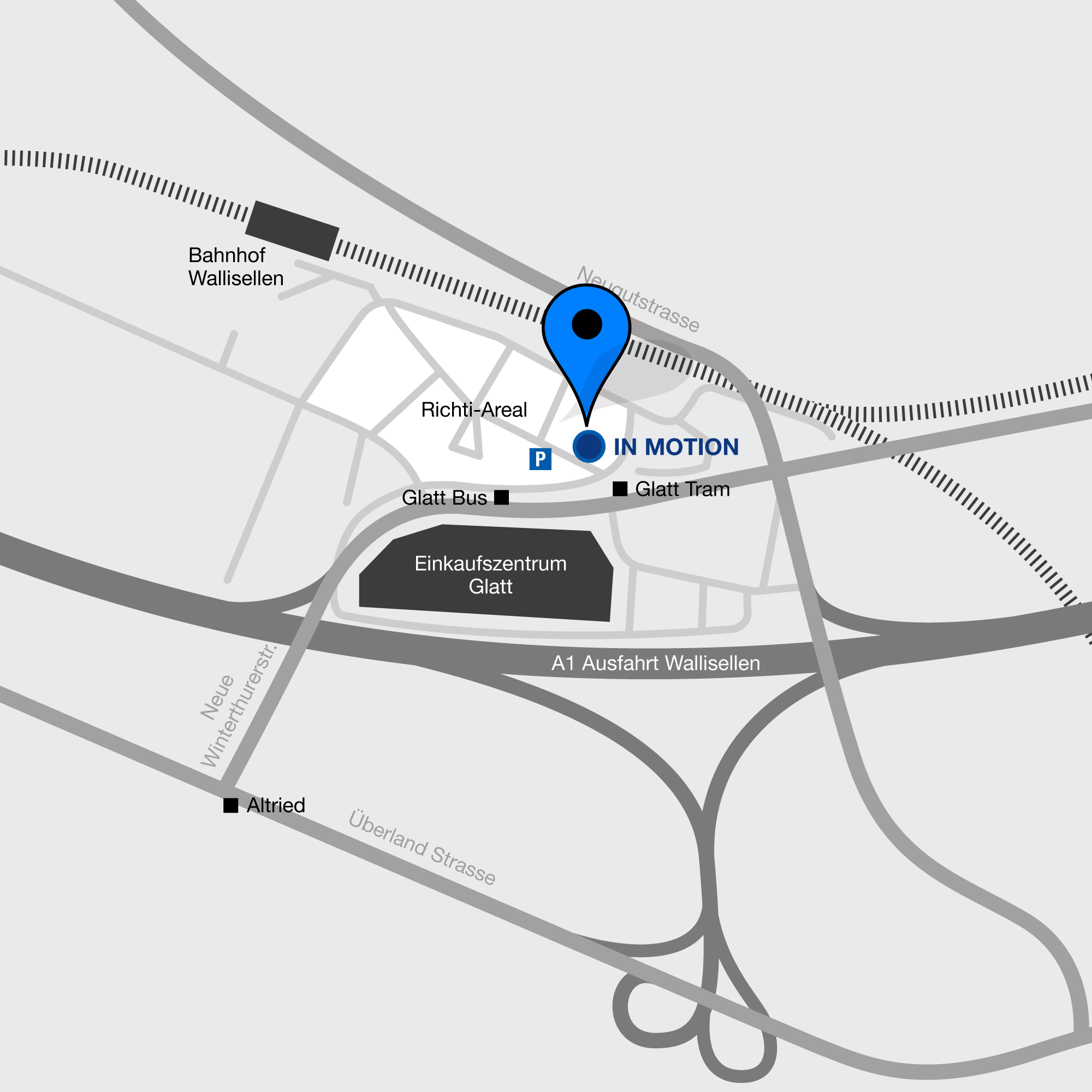 Auto: Autobahn A1 (Zürich), A53 (Uster) – Ausfahrt Wallisellen, Wegweiser Glattzentrum. Parkmöglichkeiten gibt es in unmittelbarer Nähe der Praxis
